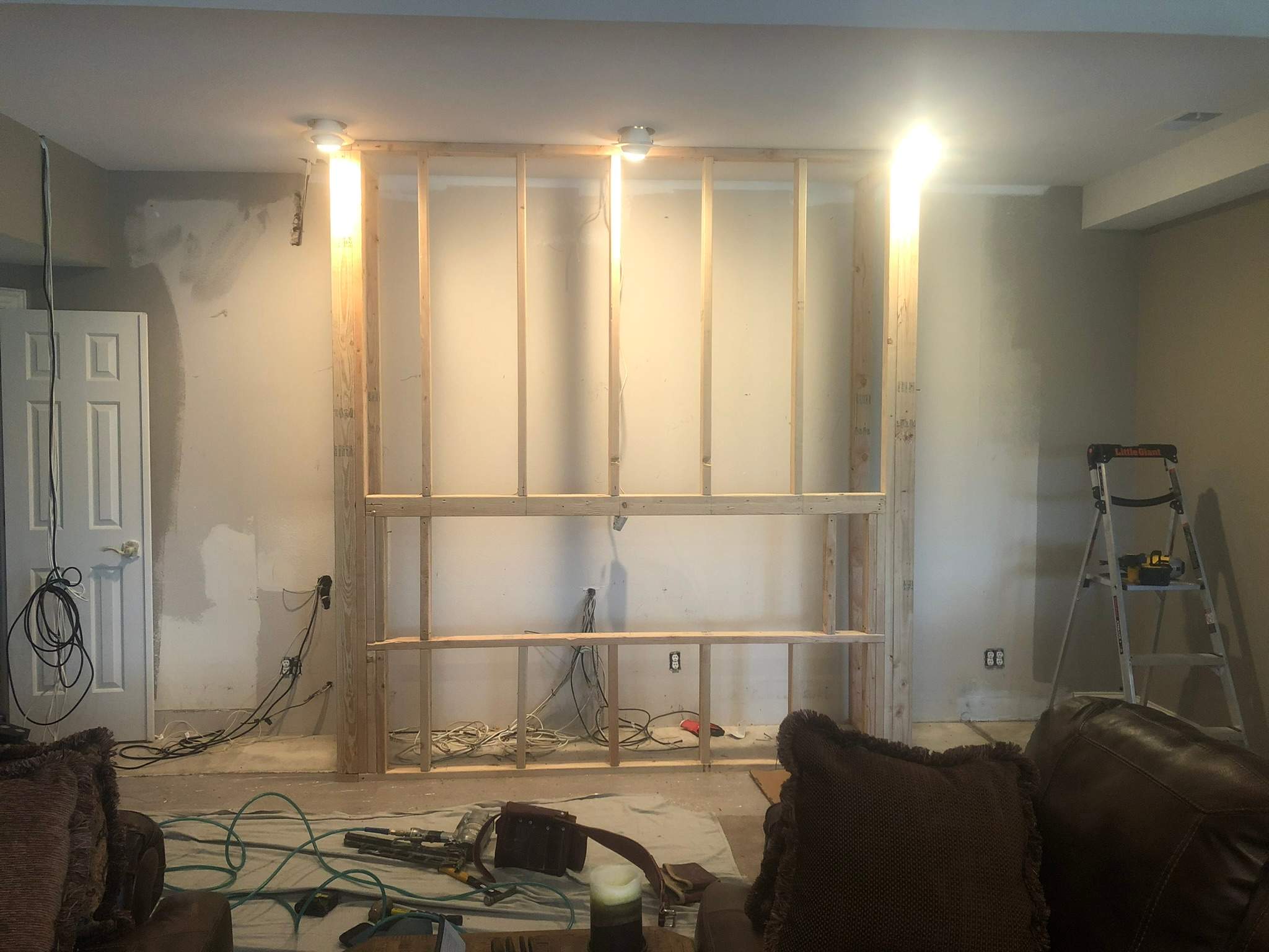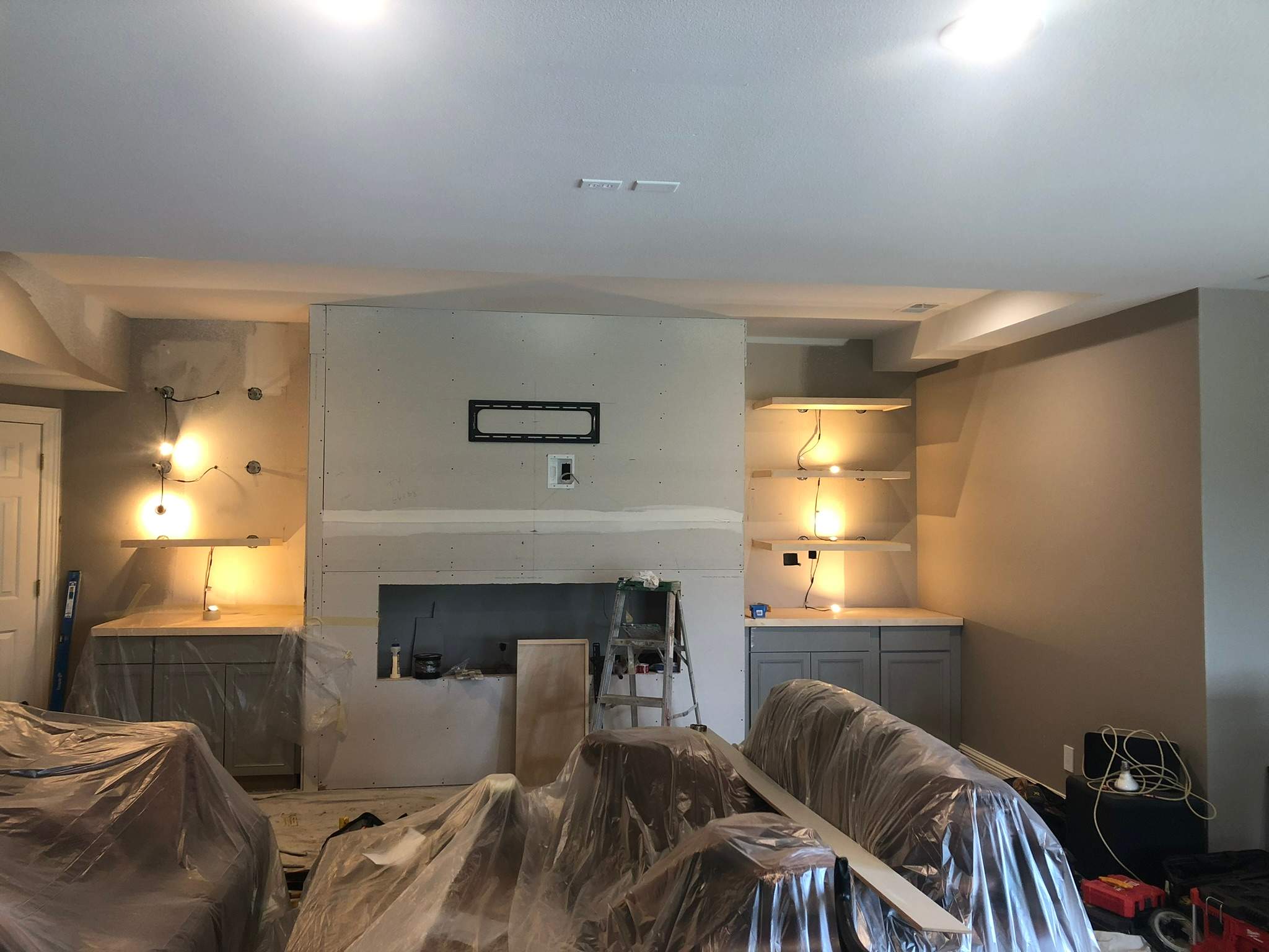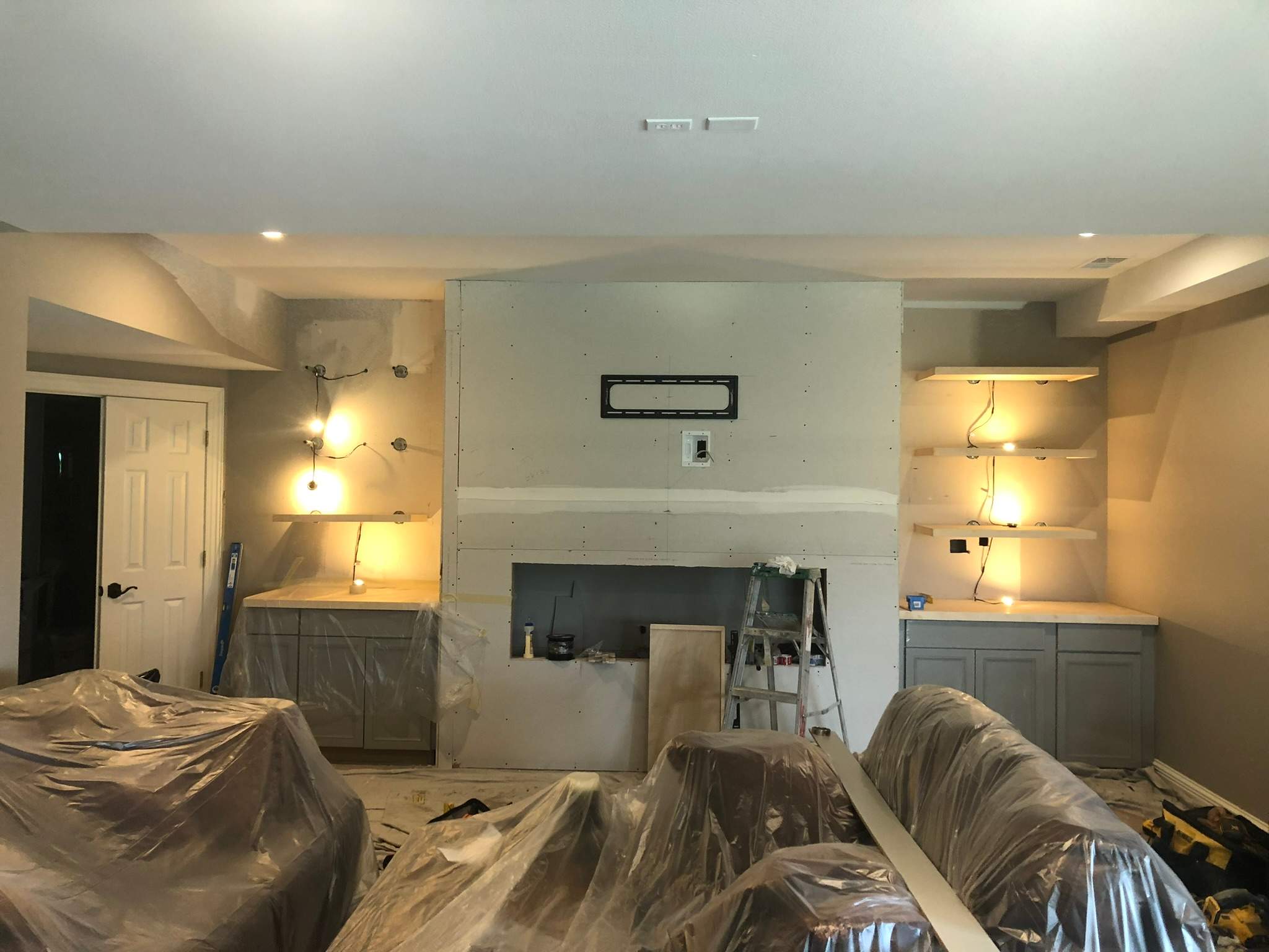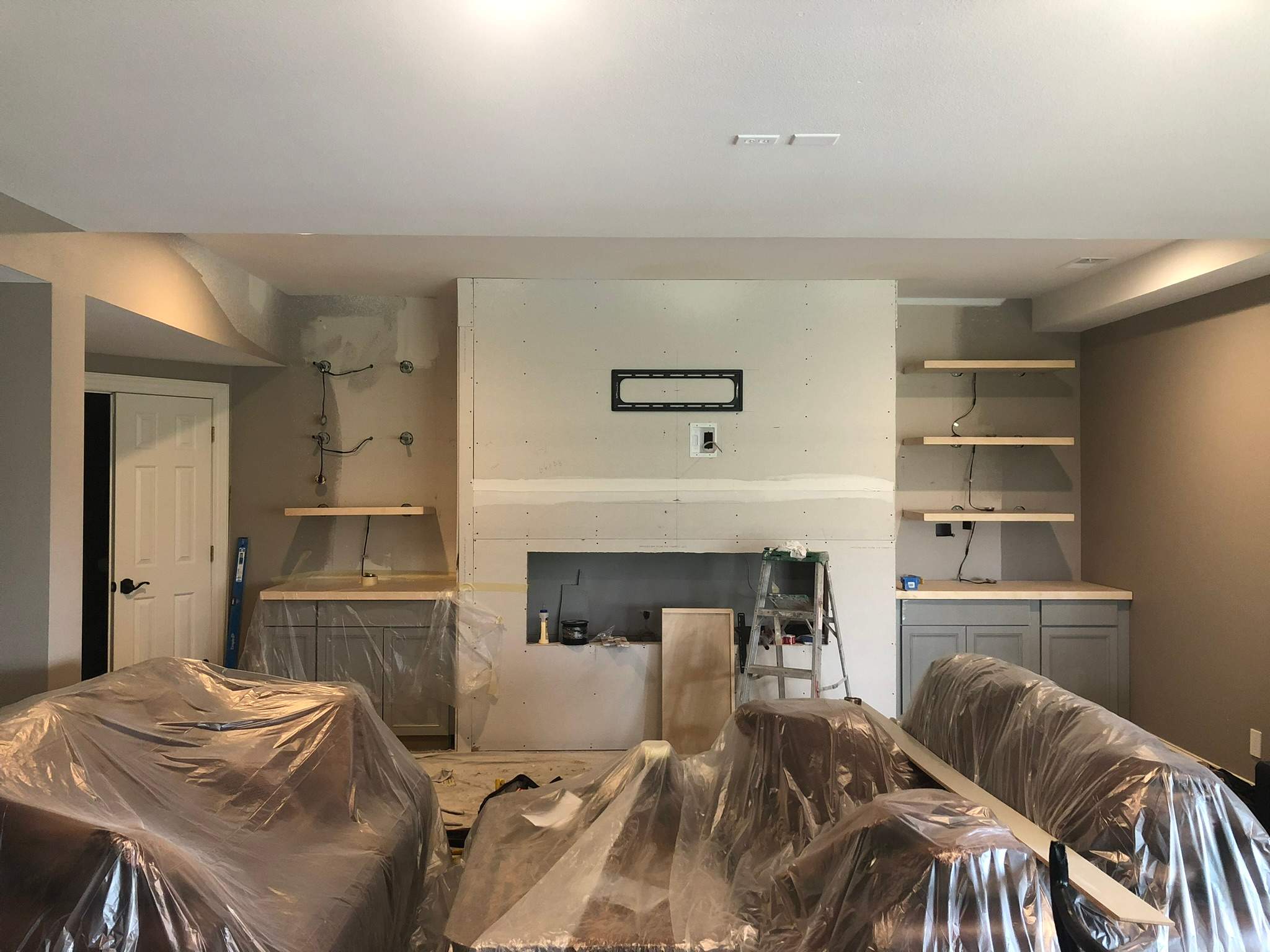 The work began with framing to establish the new layout and support for cabinetry, shelving, and the fireplace. Proper framing made sure the built-ins and fixtures would be aligned and secure, and provided the structure needed for the next steps.