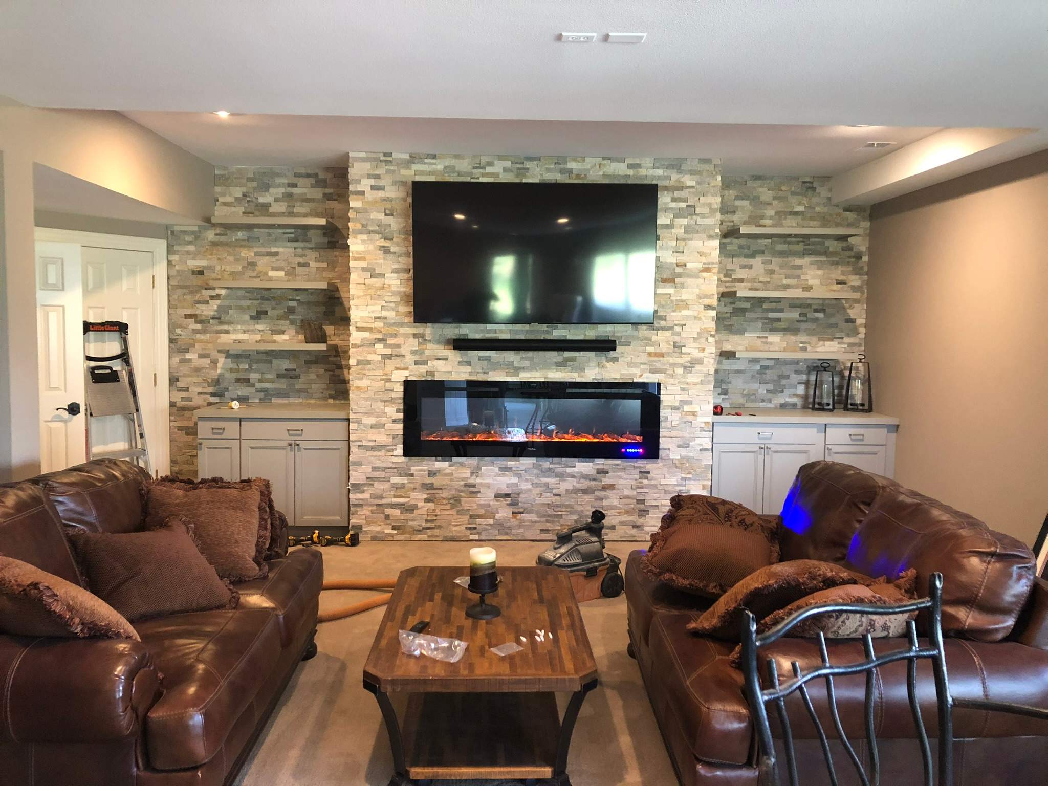 A modern fireplace was installed as part of the entertainment center, adding warmth and a cozy atmosphere to the room. The fireplace complements the stacked stone and built-ins, helping the space feel inviting and well designed.
